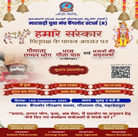 On the sacred occasion of Pitru Paksha, Marwari Yuva Manch, Bangalore Stars organized a divine and grand program under the initiative “Apne Sanskar” at Bangalore Gaushala, Mahadevapura. The aim of this event was to preserve the glorious traditions of Sanatan Dharma while promoting devotion, cultural values, and the spirit of service in society.