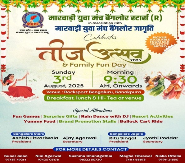 Marwari Yuva Manch Bangalore Stars and Jagruti branches jointly organized a grand Teej Festival at Rocksport Resort, located on Kanakapura Road. The event was dedicated to traditional Indian values, cultural heritage, and family bonding, and saw enthusiastic participation from more than 170 members and families.