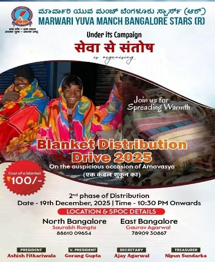 Spreading the message of compassion and service during the harsh winter, Marwari Yuva Manch Bangalore Stars successfully organized the “Blanket Distribution Service – 2025 (Ek Kambal Sukoon Ka)” under its “Seva Se Santosh” campaign. In the first and second phases of this initiative, blankets were distributed to the needy across various areas of Bengaluru.
